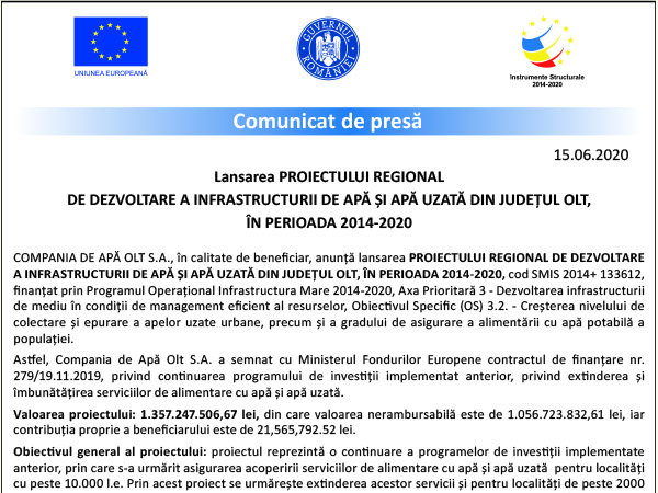 Compania de Apă Olt S.A. în calitate de beneficiar al Proiectului Regional de dezvoltare a infrastructurii de apă și apă uzată din județul Olt, în perioada 2014-2020 - etapa II