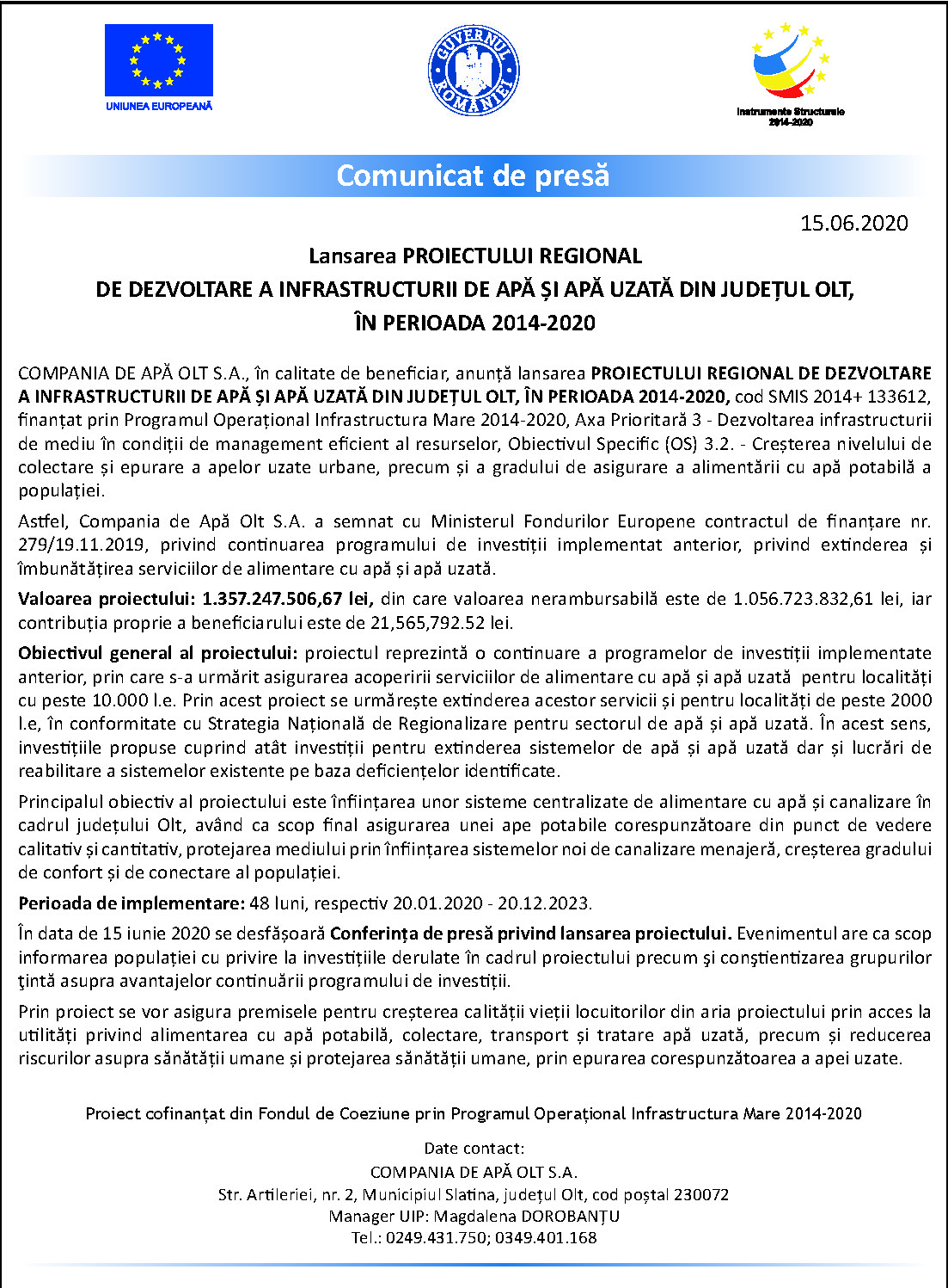 COMPANIA DE APĂ OLT S.A. în calitate de beneficiar al PROIECTULUI REGIONAL DE DEZVOLTARE A INFRASTRUCTURII DE APĂ ȘI APĂ UZATĂ DIN JUDEȚUL OLT, ÎN PERIOADA 2014-2020, cod SMIS 2014+ 133612, finanțat prin Programul Operațional Infrastructura Mare 2014-2020, Axa Prioritară 3 - Dezvoltarea infrastructurii de mediu în condiții de management eficient al resurselor, Obiectivul Specific (OS) 3.2. - Creșterea nivelului de colectare și epurare a apelor uzate urbane, precum și a gradului de asigurare a alimentării cu apă potabilă a populației,