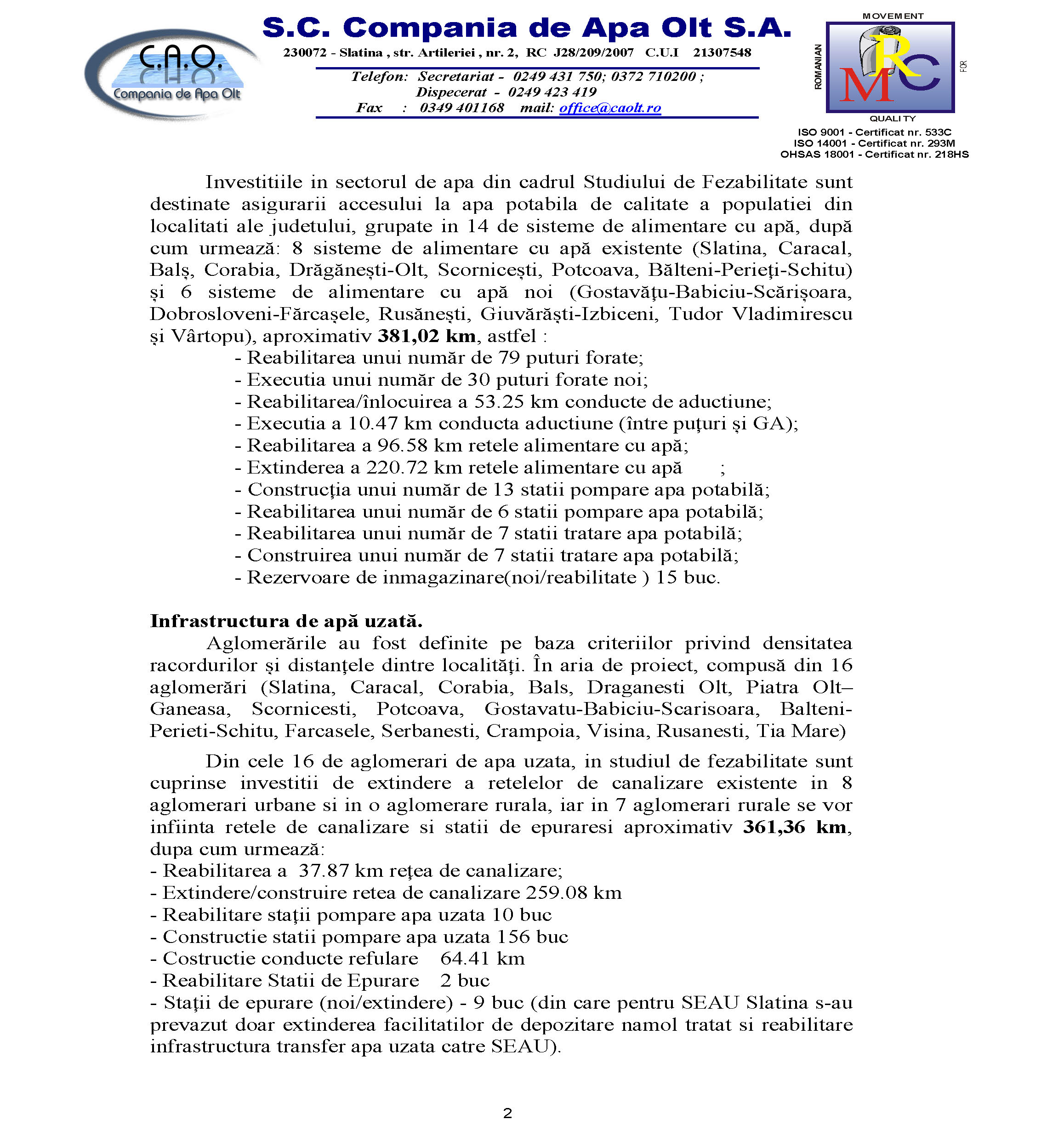 PROIECT REGIONAL DE DEZVOLTARE A INFRASTRUCTURII DE APĂ ȘI APĂ UZATĂ DIN JUDEȚUL OLT, ÎN PERIOADA 2014-2020 - etapa II