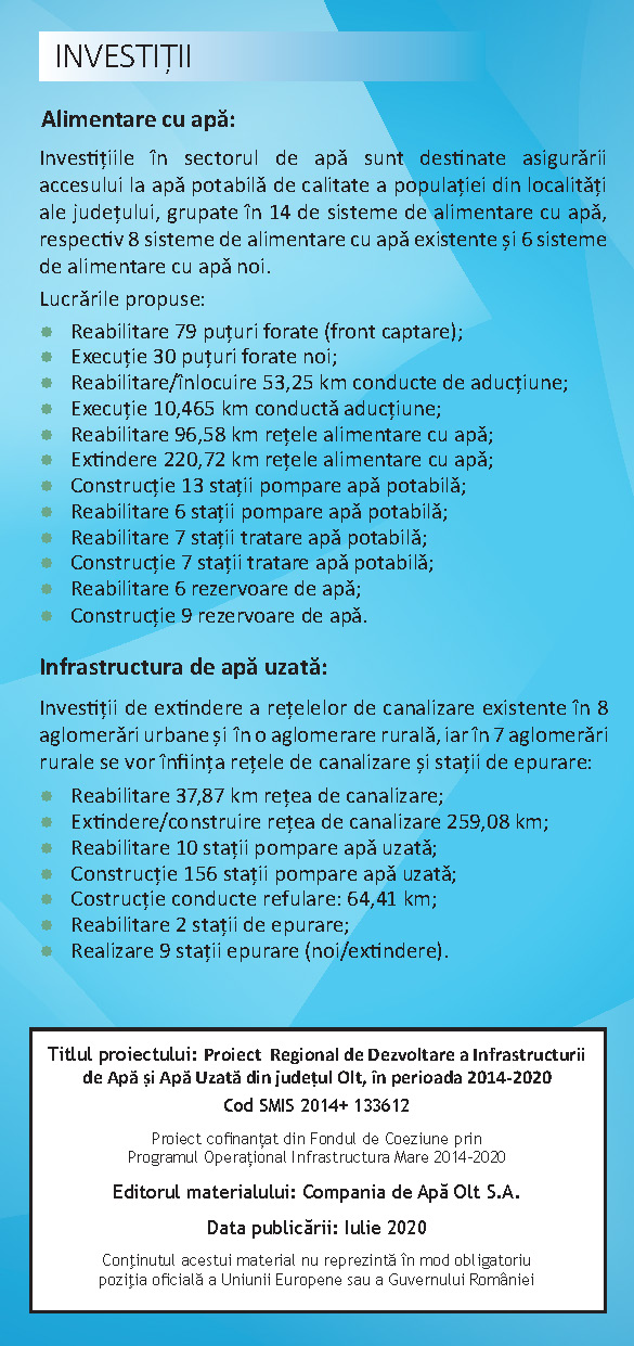 PROIECT REGIONAL DE DEZVOLTARE A INFRASTRUCTURII DE APĂ ȘI APĂ UZATĂ DIN JUDEȚUL OLT, ÎN PERIOADA 2014-2020, etapa II
