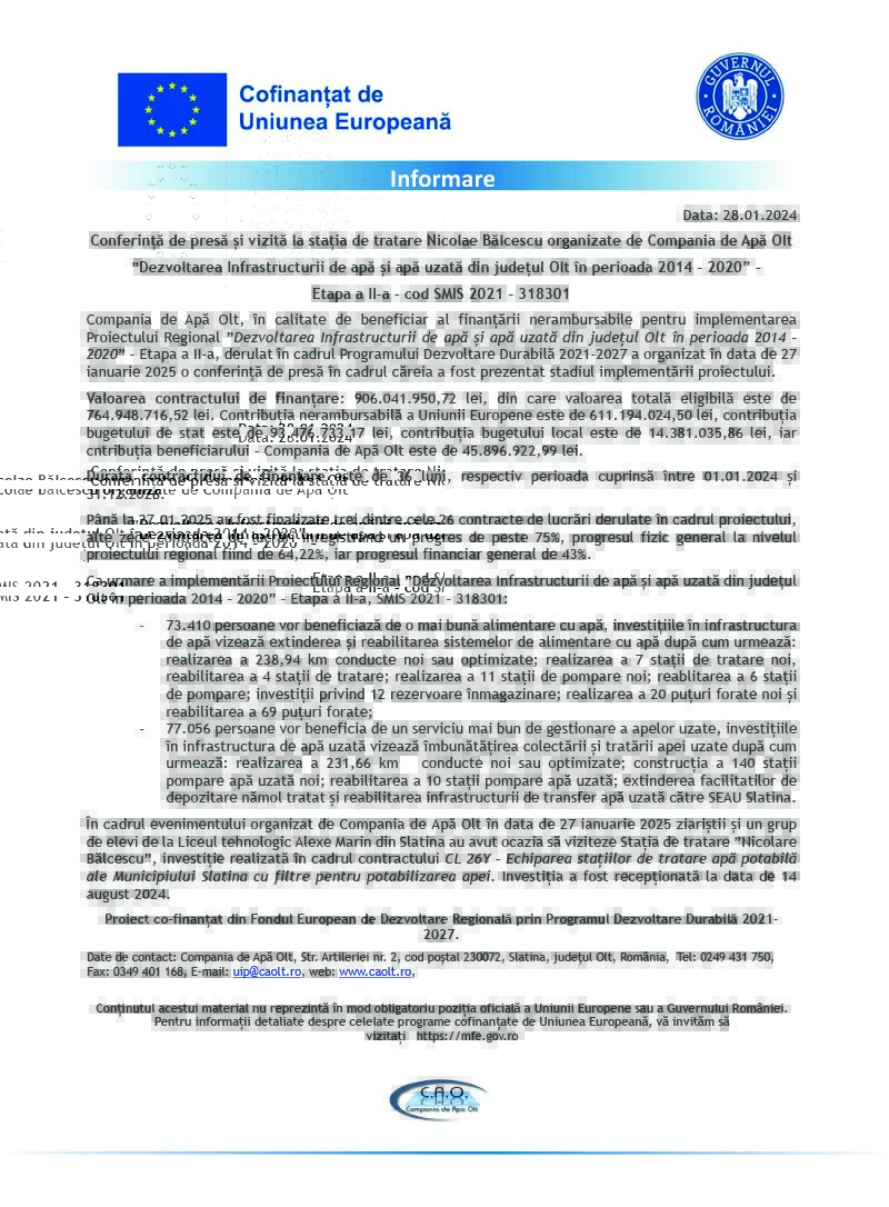 Compania de Apă Olt, în calitate de beneficiar al finanțării nerambursabile pentru implementarea Proiectului