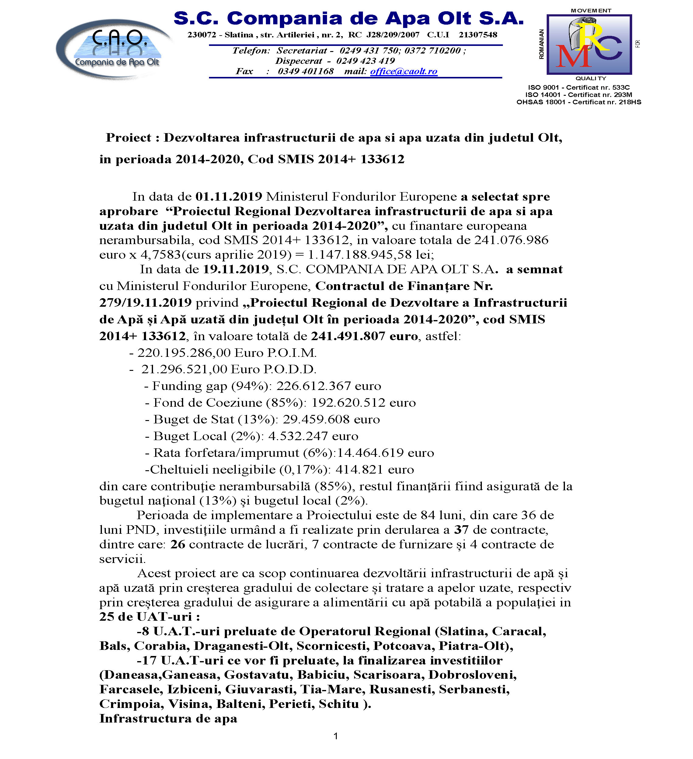 In data de 01.11.2019 Ministerul Fondurilor Europene a selectat spre aprobare „Proiectul Regional Dezvoltarea infrastructurii de apa si apa uzata din judetul Olt in perioada 2014-2020”, cu finantare europeana nerambursabila, cod SMIS 2014+ 133612, in valoare totala de 241.076.986 euro, respectiv 1.147.188.945,58 lei; In data de 19.11.2019, S.C. COMPANIA DE APA OLT S.A. a semnat cu Ministerul Fondurilor Europene, Contractul de Finanțare Nr. 279/19.11.2019.