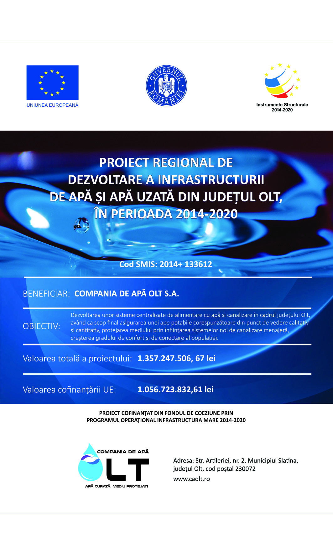 Compania de Apă Olt S.A. în calitate de beneficiar al Proiectului Regional de dezvoltare a infrastructurii de apă și apă uzată din județul Olt, în perioada 2014-2020